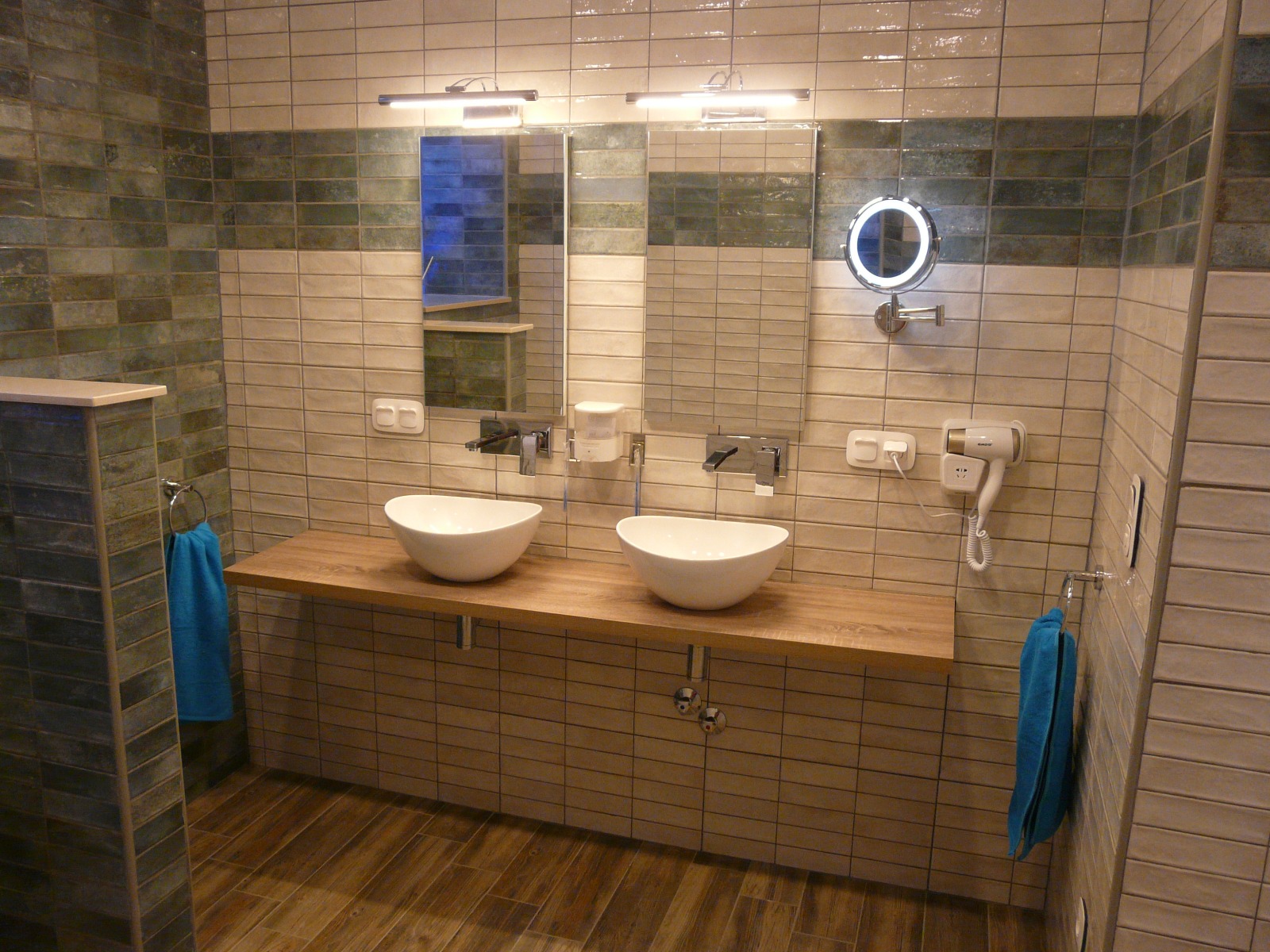 - Dubbele lavabo met dubbele stopcontacten en spiegel(verlichting)