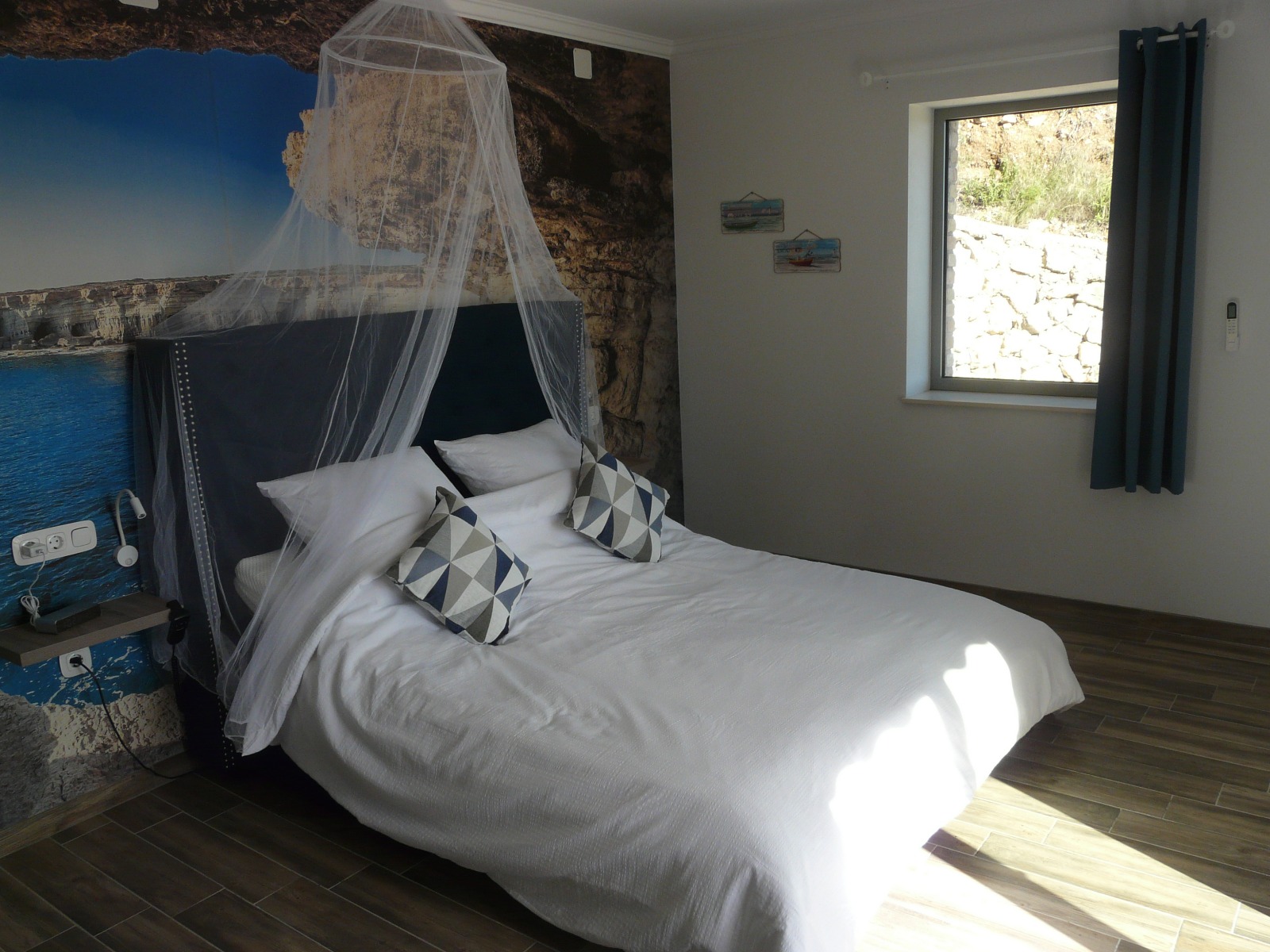 - 1,60 x 2,00 m bed met elektrisch verstelbare lattenbodem, muskietennet, LED nachtlampjes en nachtplankjes met 1 oplaad docking station met klok(voor i-phone)